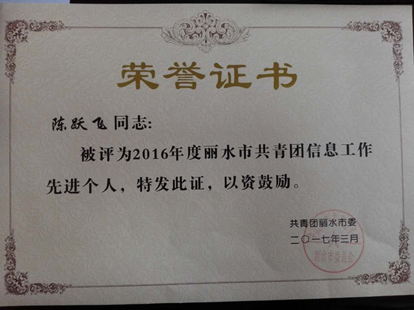 3月9日,共青團麗水市第四屆委員會第二次全體會議在市行政中心108會議室順利召開。會上,集團公司團委被授予“麗水市共青團工作目標考核優秀單位”,同時鑒于陳躍飛同志在共青團信息工作方面的突出表現,被團市委評為“2016年度麗水市共青團信息工作先進個人”。