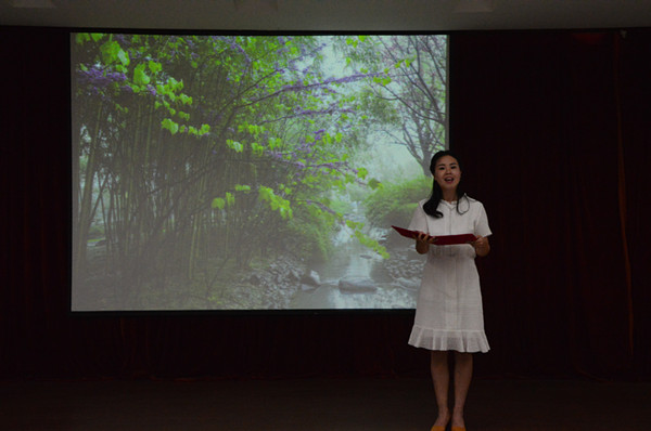 “從窗口望去,滿目蔥郁,一片綠海;柔疏條隨風(fēng)搖曳,婆娑起舞;密葉團(tuán)團(tuán)簇簇,欣欣向榮”,自創(chuàng)詩(shī)歌《綠》通過選手對(duì)情境的描繪,仿佛讓聽眾置身于綠的海洋,看到了“綠水青山就是金山銀山”的美麗麗水,同時(shí)也揭開了比賽的序幕。