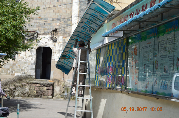 今天項目開工,沒有儀式,一切以簡潔經(jīng)濟為考量。工程負責(zé)人員進駐項目部后,工人隨即就開始粉刷外墻、拆除櫥窗等工作。