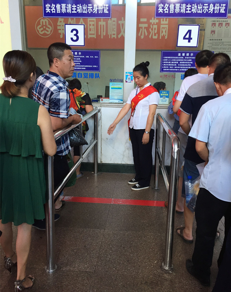自從全國文明城市創(chuàng)建工作對一米線提出要求開始,東站售票廳一米線前的文明勸導(dǎo)工作就落在了站售組的組員身上。