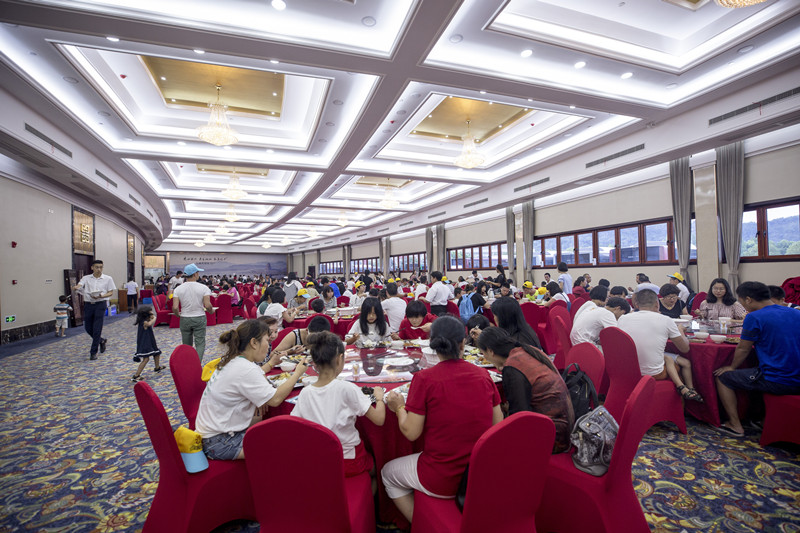 8月13日晚上,九城宴會中心熱鬧非凡,宴會大廳及休閑中廳擺滿了桌椅,紅色的桌椅布套顯得格外喜慶,酒店門前停滿了旅游大巴車,進店的游客排起了長長的隊伍,這是九城宴會中心自開業以來接待的首場千人宴。