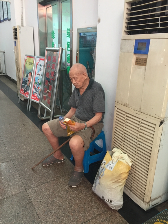 8月16日下午,一位老大爺在東站售票廳里,迷茫地走來走去,由于年歲已高,他走的每一步都顯得有點力不從心。