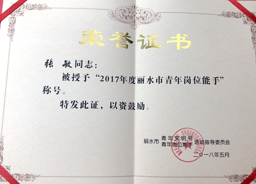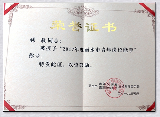 經麗水市“青年文明號、青年崗位能手”活動指導委員會評定,集團公司青年團員張敏同志獲評“2017年度麗水青年崗位能手”榮譽稱號。