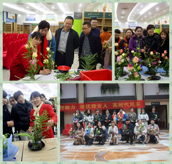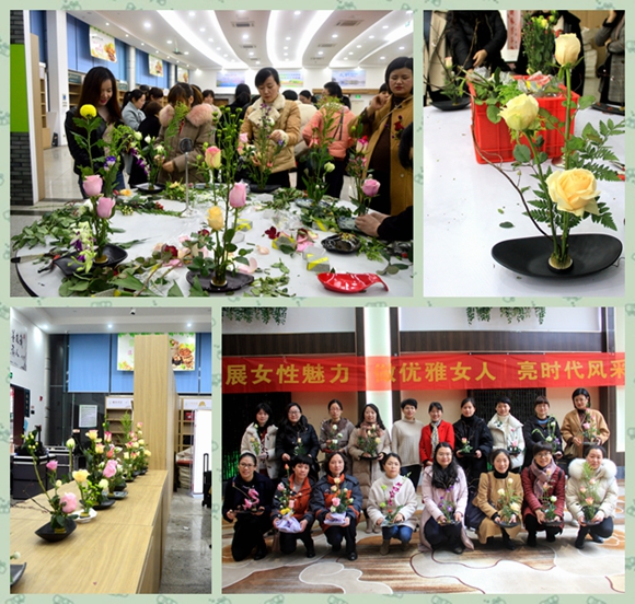 在插花分會場,麗水職業技術學院邱東萍副教授給大家講解插花藝術和技巧,特別教了時下流行的用劍山插花技巧。緊接著女工們進行插花實踐操作,分組進行插花比賽,只見女工們使出渾身解數,在美麗的鮮花面前,個個都心靈手巧,她們有用劍山、有用花泥插花,很快一盆盆靚麗的鮮花就得以呈現。邱東萍教授和助手們選出好的作品給大家一一作了點評。