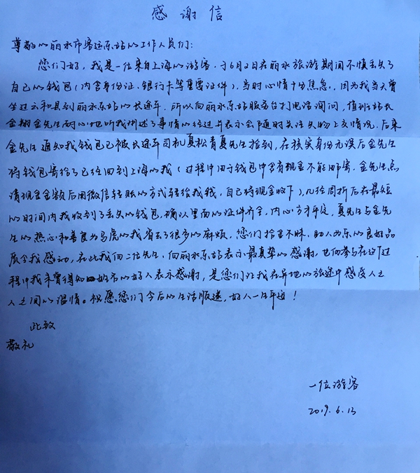 6月16日,東站服務臺收到了一封來自上海的感謝信。信中署名為一位游客的失主在信中向值班站長金翔和駕駛員夏松青及東站的工作人員表達了感激之情。
