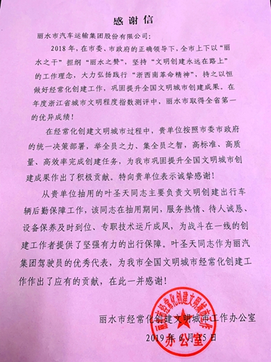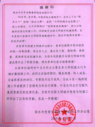 信中還特別表揚了從集團公司抽用的葉圣天同志,在工作中服務熱情、待人誠懇、設備保養及時到位、專職技術運斤成風,為戰斗在一線的創建工作者提供了堅強有力的出行保障。葉圣天同志作為麗汽集團抽用的、主要負責文明創建出行車輛后勤保障工作的優秀駕駛員代表,為我市全國文明城市經?;瘎摻üぷ髯鞒隽藨械呢暙I。