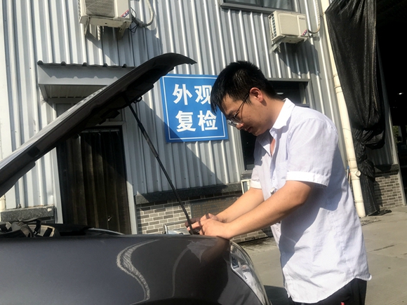 【外觀檢測員】當他彎下腰檢測的那一刻,豆大的汗珠在他的額頭和臉頰上涌出,并沿著他的顴骨、鼻梁淌下。“烈日下的車身,溫度通常在60℃以上,而越往車頭下方,溫度越高??墒窃贌嵋膊荒茏屲囍鞫嗟?。”他說完這話,又接著復(fù)檢下一輛車。