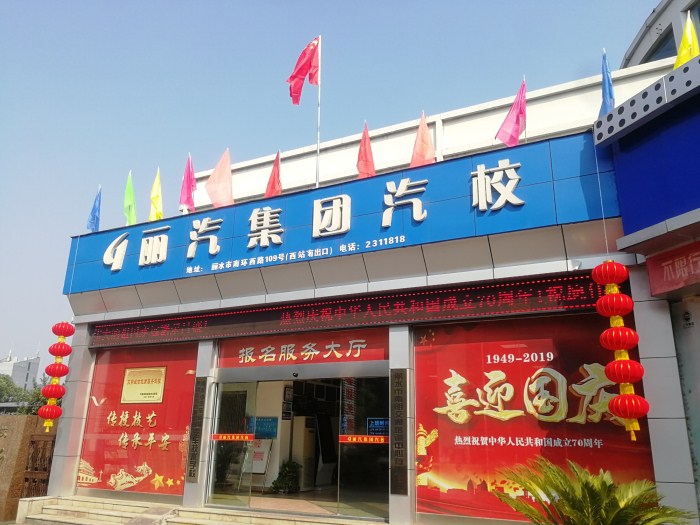鮮艷的五星紅旗懸掛在汽校報名注冊中心大門頂端,四周插著五顏六色的旗幟,在藍天的映襯下顯得格外耀眼。大門兩側,兩排喜慶的紅燈籠隨風搖曳,烘托著祥和的節日氛圍。LED屏上,“熱烈慶祝中華人民共和國成立70周年”、“祝愿偉大的祖國永遠繁榮昌盛”的標語滾動播放,氣氛濃厚。“喜迎國慶”的巨大金色標語和汽校“傳授技藝、傳承平安”核心價值的巨幅廣告相互輝映,相得益彰。