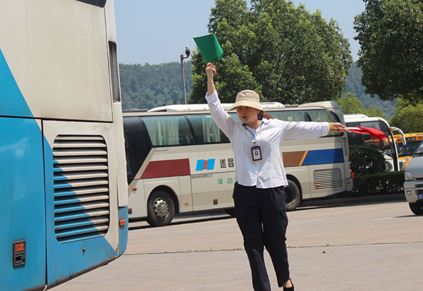 8月3日上午10:30分,地表溫度已經(jīng)接近50攝氏度,走在室外,隔著鞋底就能感受到地面上滾燙的溫度,行車員洪麗頭頂烈日,認(rèn)真地為車輛引航,吹哨、倒走、揮動紅綠旗、小跑……一套動作下來,豆大的汗水從額頭滴下來。
