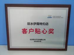 近年來,伊翔公司在主抓生產的同時,講實效、重管理,不斷完善企業內部管理制度,服務質量日趨提升。日前,從北京現代公司總部傳來喜訊:麗水市伊翔汽車銷售服務有限公司榮獲北京現代汽車有限公司頒發的“客戶貼心獎”和“M/S進步獎”,王明敬獲北京現代2012年度“優秀銷售顧問”稱號。