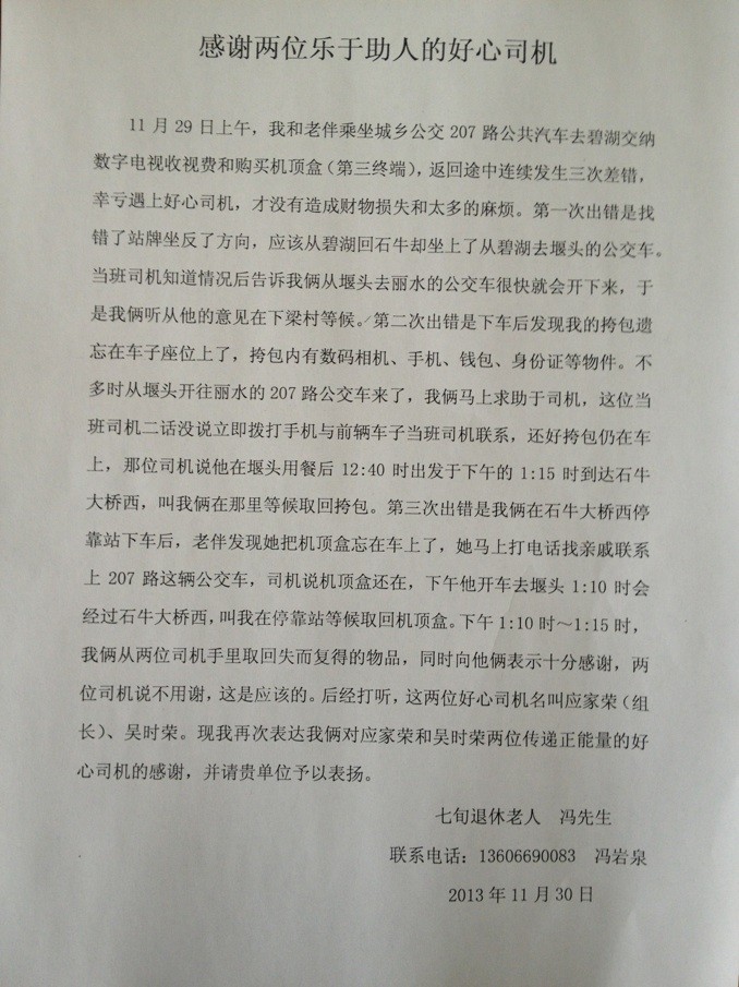 經了解,11月29日上午,市民馮先生和他老伴乘坐207路公交車去碧湖繳納數字電視收視費和購買機頂盒,在往返途中連續發生三次差錯,幸好遇上好心司機,才沒有造成財物損失和太多的麻煩。第一次出錯是找錯了站牌坐反方向。兩位老人繳費和購買機頂盒后,應該從碧湖回石牛,但卻坐上了碧湖去堰頭的公交車。當班司機知道情況后,及時將車停靠,并詳細告訴老人從堰頭去麗水的公交車很快就會開來,告訴他們應該哪里下車,于是兩位老人在下梁村等候。第二次出錯是下車后,馮巖泉發現下車地點對了,但挎包遺忘在車子座位上了,挎包內有數碼照相機、手機、錢包、身份證等物件。沒多久從堰頭開往麗水的K207路公交車來了,馮巖泉馬上向司機求助,這位當班司機立即撥手機與前輛當班司機聯系,還好挎包仍在車上,司機說他在堰頭用餐后12點40分出發,于下午的1點15分到達石牛大橋西,叫老人在那里等候取回挎包。第三次出錯是在石牛大橋西??空鞠萝嚭?,馮巖泉老伴發現她把機頂盒忘在車上了。老人通過親戚打電話聯系上了他們剛才乘坐的公交車,司機說機頂盒還在,下午他開車去堰頭1點10分會經過石牛大橋西,叫老人在停靠站等候取回。下午1點10分-15分,馮巖泉分別從兩位司機手里取回了失而復得的挎包和機頂盒,同時向他倆表示十分感謝,并再三詢問駕駛員姓名,想通過媒體進行表揚一下。而這兩位司機都笑笑說:“這是件非常普通的事,誰遇到這種事都會這么做的”。