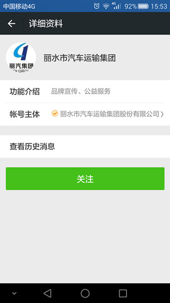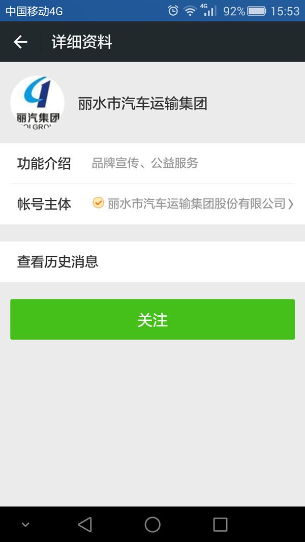 (1)打開微信,搜索添加“麗水市汽車運輸集團”微信公眾號或直接掃取二維碼,點擊關注。