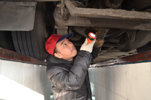 此時又一輛待檢車輛開入門檢線,何俏杰從兜里掏出一個手電筒,走入門檢地溝,用手電照看車輛底盤的情況。“轉動軸正常”“傳動軸正常”“剎車正常”“無漏油”,然后他又繞著車子“轉向燈”“防霧燈”“大燈”“雨刮器”…… 雖然只是些很小的細節,何俏杰都一一仔細的檢查,同時將結果告知駕駛員,接著他進入車廂內部,查看車內安全錘,滅火器是等安全設施配備情況。各項檢查正常,何俏杰拿出門檢單,嫻熟地在門檢單上填寫被檢車輛的車牌號、時間,然后簽字、蓋章。