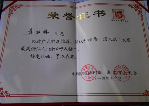 “發(fā)現(xiàn)最美浙江人--浙江好人榜”推薦評選活動由省委宣傳部、省文明辦聯(lián)合開展,每月推薦評選一次,旨在為大力培育和弘揚社會主義核心價值觀,積極普及和踐行當代浙江人共同價值觀,進一步深化“發(fā)現(xiàn)‘最美浙江人’、爭做‘最美浙江人’”主題宣傳實踐活動,健全和完善“浙江好人”選樹和培育機制,推動“最美”從“盆景”變成“風景”、從“風景”變?yōu)椤帮L尚”。推薦評選分為助人為樂類、見義勇為類、誠實守信類、敬業(yè)奉獻類和孝老愛親類五個類別。評選活動經(jīng)過網(wǎng)絡(luò)投票、群眾評議、專家評審等環(huán)節(jié),12月份共評選出25名浙江好人,章雙林入選見義勇為類浙江好人。