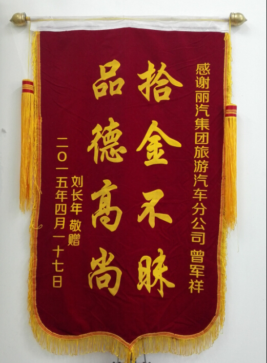 旅客劉長年回顧說,自己在4月15日來麗水市委黨校開會,會議包的是麗汽集團旅游汽車分公司的車。晚上會議結(jié)束以后就直接下車了,當時也沒有留意自己的錢包丟在車上,后來到了賓館才發(fā)現(xiàn)自己錢包丟了,十分的著急,因為自己是華僑,包里面的很多卡十分的重要,而且補辦起來很困難。后來問了經(jīng)辦人才得知駕駛員的電話。第2 天來到麗汽集團旅游汽車分公司的時候,發(fā)現(xiàn)自己的錢包已經(jīng)安安全全的放在前臺工作人員那里了。我當時拿了500塊錢想感謝駕駛員,但是好心的駕駛員婉言拒絕了,就說了句“這是應該做的”。我想想還是做點實際的來表示我對這位拾金不昧、品德高尚的駕駛員的謝意,所以就送上了這面錦旗。