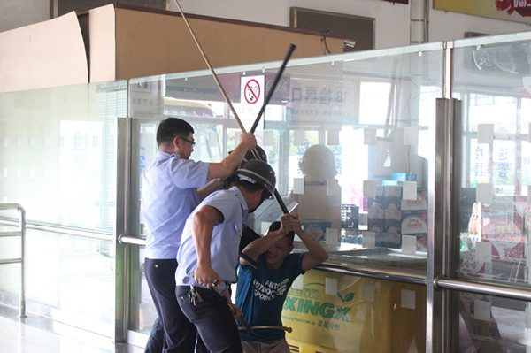 首先進行科目一:通訊聯絡演練 候車廳發現可疑人員,經理室用對講話機發出“經理室通知,各崗位加強安保”信息,各崗位收到后回復“XX崗位已收到”,以檢驗各崗位對講機使用的熟練程度和規范性。 隨后進行科目二:突發性事件應急處置演練 行車員發現普客候車廳內有一名醉酒男子情緒激動揮舞木棍,危及旅客安全,立即跑向調度室向業務站值班站長報告,值班站長接到報告后通過對講機向其它崗位呼叫。并立即組織本部門值班人員趕到現場將旅客疏散到安全的區域;保衛科接到報告后立即做出回應,啟動反恐防范應急預案,攜帶反恐防范器具前往現場控制住施暴者;同時由2名保衛人員組成警戒協調組也到達現場負責外圍的警戒工作。