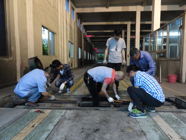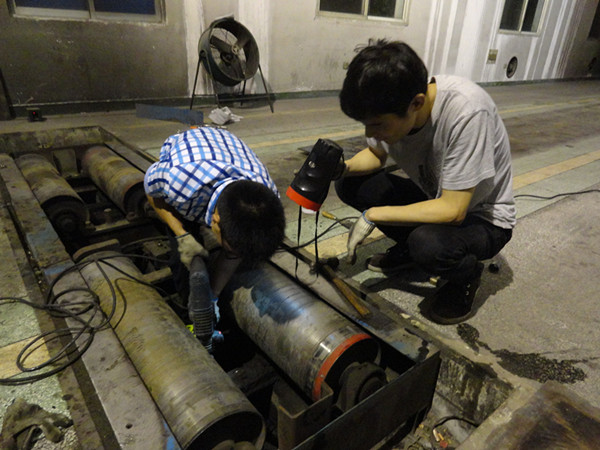 7月7日下午臨下班前,綜檢站1號檢測線的車速臺突然發生故障,舉升器無法正常升降。故障就是命令,為確保綜檢站高峰期檢測不受影響,檢測車間立即組織骨干人員對車速臺進行檢查,就連正在年休的車間主任金軍輝也聞訊趕回與部門員工一同作戰。經過一番拆卸檢查,故障點基本確定是油缸漏油和舉升橫梁斷裂??墒?,要維修這兩個大部件,就需要拆掉整個工位機的核心部分,其工作量和工作難度之大,讓在場的搶修人員都不由的皺緊了眉頭。面對艱巨任務,車間副主任、高級技師金曉東發揮了黨員先鋒模范帶頭作用,迅速帶領青年員工對舉升橫梁進行焊接技術改造。車間員工們也齊心協力開始拆卸工位機,更換油缸油封、密封圈等。白天已超負荷工作的檢測車間員工,不知不覺又堅持了9個多小時,直至7月8日凌晨01點,最終圓滿完成了車速臺搶修任務,確保了綜檢站高峰期檢測不受影響。