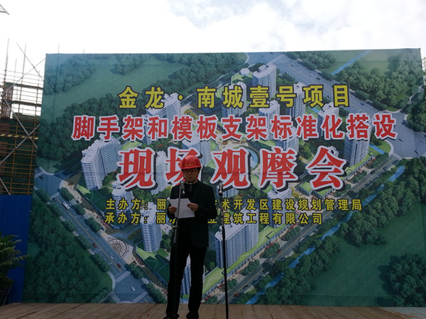 12月3日,由麗水經濟技術開發區建設規劃管理局主辦的建筑施工現場觀摩會在金龍?南城壹號項目工地現場召開。市建設局領導、開發區建規局領導、開發區在建和即將開建項目的建設單位、監理單位、施工單位共100余名代表走進項目現場,全方位觀摩了南城壹號項目的安全標準化工地、項目精細化管理、人性化服務、特別是對腳手架和模板支架標準化搭設等內容。
