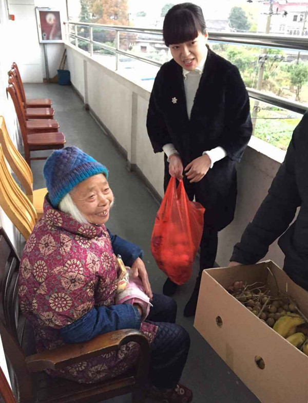 經過20多分鐘的車程,下午3點,我們的車子到達了靈山敬老院,因為事先聯系,已經有許多老人在門口等候我們。與在場的老人一一問候后,我們十余名團員迅速分工,將帶來的水果和餅干等點心給不同樓層的老人送上,并帶上大家的祝福。我們的到來,使原本安靜的敬老院變得熱鬧,歡笑聲此起彼伏,我們陪著老人聊天,給他們送上熱騰騰的開水,將順手剝好的水果遞上。