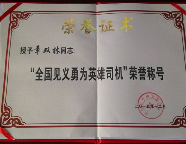 今年7月份,經(jīng)過蓮都區(qū)公安分局、麗水市公安局和浙江公安廳的層層推薦,章雙林通過初評,入選60名見義勇為英雄司機候選人(群體)。10月23日0時至11月22日24時進行了網(wǎng)絡(luò)投票,最終順利入選“全國見義勇為英雄司機”,成為浙江省獲得十二屆“昆侖獎”全國十大見義勇為英雄司機的兩位英雄司機之一。(另外一名是湖州市安吉縣遞鋪鎮(zhèn)赤芝村村民,司機王剛。)