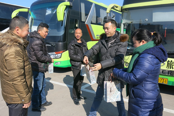 2016年1月25日上午,旅游集散中心經理翁偉邦、副經理薛虹及車隊隊長王華南一行前往汽車東站,給在東站參加長途加班運輸工作的駕駛員送去節前問候和慰問品。慰問中一再叮囑駕駛員要注意安全,在駕車時必須控制好車速,做好保暖工作,搭班駕駛員互相照應,不疲勞駕駛,注意自身健康。