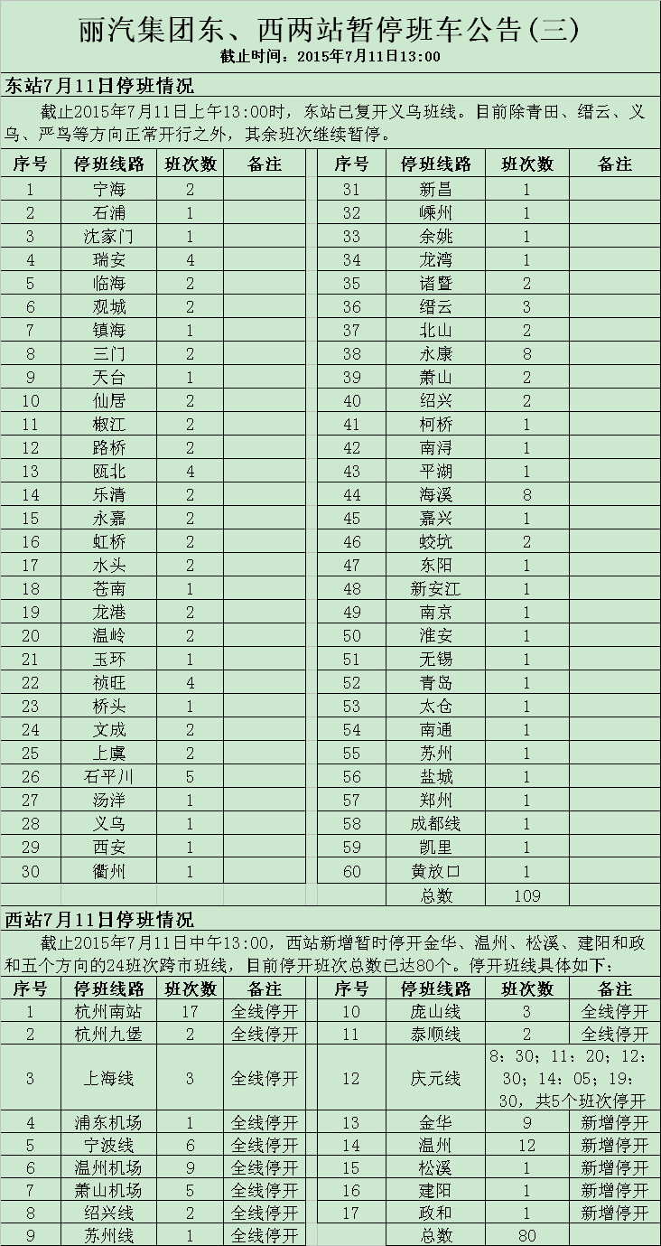 截止7月11日13:00,麗汽集團東、西兩站班車停復班情況: