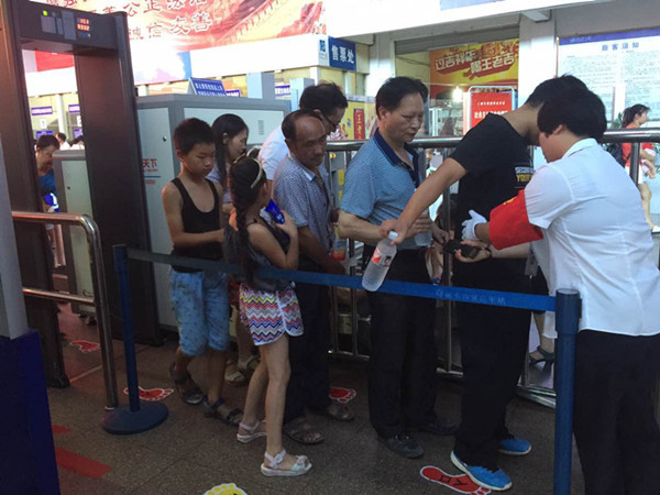 活動第一天,佩戴志愿者紅袖章的同志已經(jīng)穿梭在車站的各個角落,熱情的為來往旅客服務(wù)。在售票大廳,為旅客介紹客車的運行班次,引導(dǎo)幫助旅客使用自助售票機(jī)購票;在服務(wù)總臺,為未帶身份證的旅客辦理信息登記工作;在安檢口,積極督導(dǎo)旅客進(jìn)行人物分離安檢,維持排隊秩序;在候車大廳,為旅客提供免費防暑涼茶,宣傳客車服務(wù);在長途班車檢票口,幫助不熟悉實名檢票的旅客順利檢票通過。